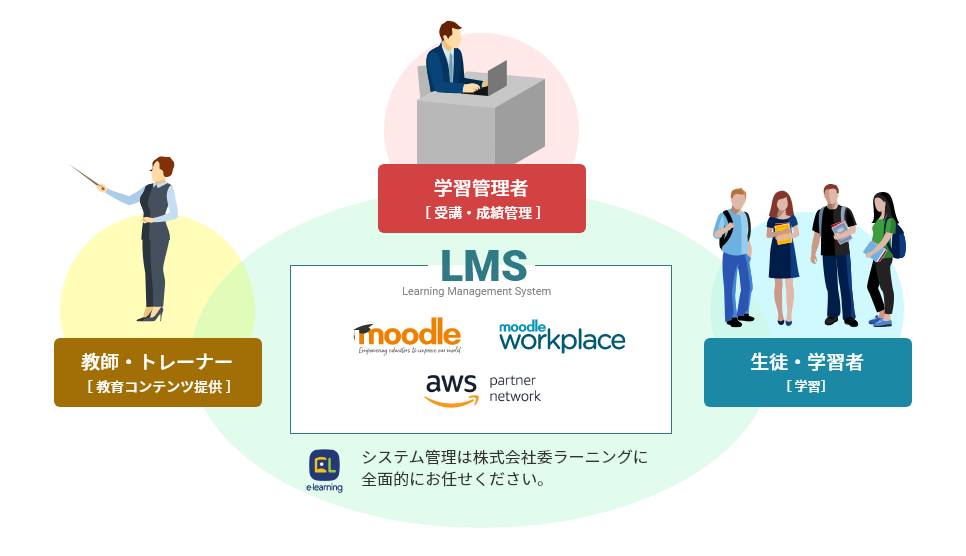 LMSとはLearning Management System(学習管理システム)の略。生徒(受講者)、先生(講師)、学習管理者を結ぶeラーニングのプラットフォームです。